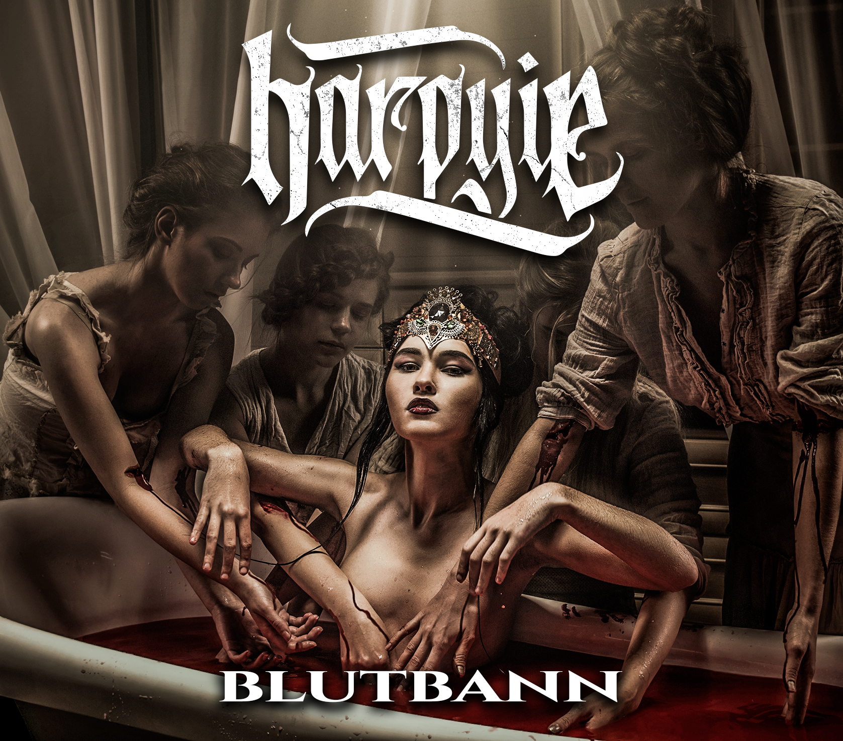 Der Name ist Programm, denn die Blutthematik zieht sich (Achtung, Kalauer!) wie ein roter Faden durch die gesamte Platte, mal im übertragenen, mal im wörtlichen Sinne. Schon der Titel des mit einer Mischung aus düsteren Elektroklängen, fetten Gitarren und Sprechgesang beginnenden Openers bezeichnet eine ausgesprochen blutige Hinrichtungsmethode der Wikinger, auch wenn er hier im übertragenen Sinne für die Aufopferungsbereitschaft des lyrischen Ichs für seine Liebste verwendet wird. Trotzdem ist die allgemeine Marschrichtung damit klar. „Liebe Auf den Ersten Biss“ spielt im melancholischen Gewand mit der Vampirthematik, kommt aber gesanglich im Refrain leider etwas dünn daher. „Die Geister, Die Ich Rief“ klingt heavy und metallisch aus den Boxen. Das eindeutige Highlight aber des Albums ist „Nachtfalter“, das mit gleich zwei Überraschungen aufwartet. Nicht nur, dass HARPYIE hier niemand Geringeren als ASP für einen Gastauftritt verpflichten konnten, auch die musikalische Ausrichtung überrascht: „Nachtfalter“ hat mit Mittelalter eigentlich überhaupt nichts mehr zu tun, sondern ist eine feine Gothic-Hymne, deren Intro, Arrangement und Songstruktur ausgeprägte Erinnerungen an klassischen Finnenrock der Marke HIM wachrufen. Die Kombination aus melodiösem Keyboard und vorwärtstreibender Gitarre hat Ohrwurmgarantie und auch die Stimmen von HARPYIEs Aello und ASP harmonieren hier hervorragend. Der Mittelalter-Rocker „Verräterisches Herz“ verneigt sich thematisch vor Edgar Allan Poes gleichnamiger Kurzgeschichte, das abschließende „Ich Glaub Dir Nicht“ präsentiert sich etwas ruhiger und lässt die Platte balladesk ausklingen. Insgesamt präsentiert sich das Album druckvoll und düster, mal wuchtiger, mal etwas ruhiger. Der Sprechgesang hat zugenommen (ob einem das nun gefällt oder nicht, ist zwangsläufig Geschmackssache) und in den cleanen Gesangsparts wäre manchmal etwas mehr Volumen wünschenswert, aber alles in allem liefern HARPYIE mit „Blutbann“ ein rundes Werk ab.