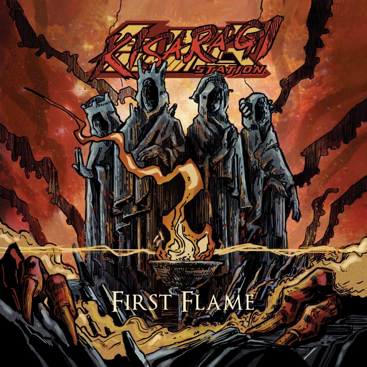 Musikalisch entpuppt sich „First Flame“ als wahre Wundertüte, die sich einen feuchten Dreck um musikalische Konventionen, kommerzielle Songstrukturen oder Genregrenzen kümmert. Wenn eine junge Band versucht möglichst viele Ideen in meist überlange Songs zu stecken, dann hat man nicht selten ein Flickenteppich an besseren und schlechteren Ideen, die einen Fluss vermissen lassen, der trotz progressivem Anspruch einen guten Song ausmacht. Und genau hier überraschen KISARAGI STATION auf ganzer Linie. In den einzelnen Songs passiert unheimlich viel und trotzdem gibt es diesen „Flow“ auch bei wahnwitzigen Übergängen, halsbrecherischen Tempowechseln oder dem Mix aus hartem, mit Growls unterlegtem Metalriffing und gänzlich fragilen Passagen. Alleine wie sich ein Song wie „King’s Gambit“ langsam aber unheilschwanger aufbaut, ist großes Kino. Auch verkommt die technische Komplexität nicht zum selbstdarstellerischen Show-Off, sondern gibt den Songs Tiefe, Anspruch und dem Hörer die Möglichkeit bei verschiedenen Hörgängen neues zu Entdecken. So ist beim ersten Durchgang ein Gitarrensolo im Fokus der Aufmerksamkeit, nur um bei zweiten Mal den virtuosen Basslauf darunter zu entdecken. KISARAGI STATION schaffen die unterschiedlichsten Einflüsse von SPOCK’S BEARD, über QUEEN, MAGELLAN oder auch DREAM THEATER und HAKEN mit 70ies Rock, Death Metal und manchmal auch Alternative Rock oder einem Hauch Fahrstuhlmusik zu kombinieren und daraus was wirklich Eigenständiges zu formen. Was -und das ist die große Kunst- bei allem verkopftem Anspruch auch einfach als tolle Musik funktioniert, in der man sich verlieren und sich treiben lassen kann.